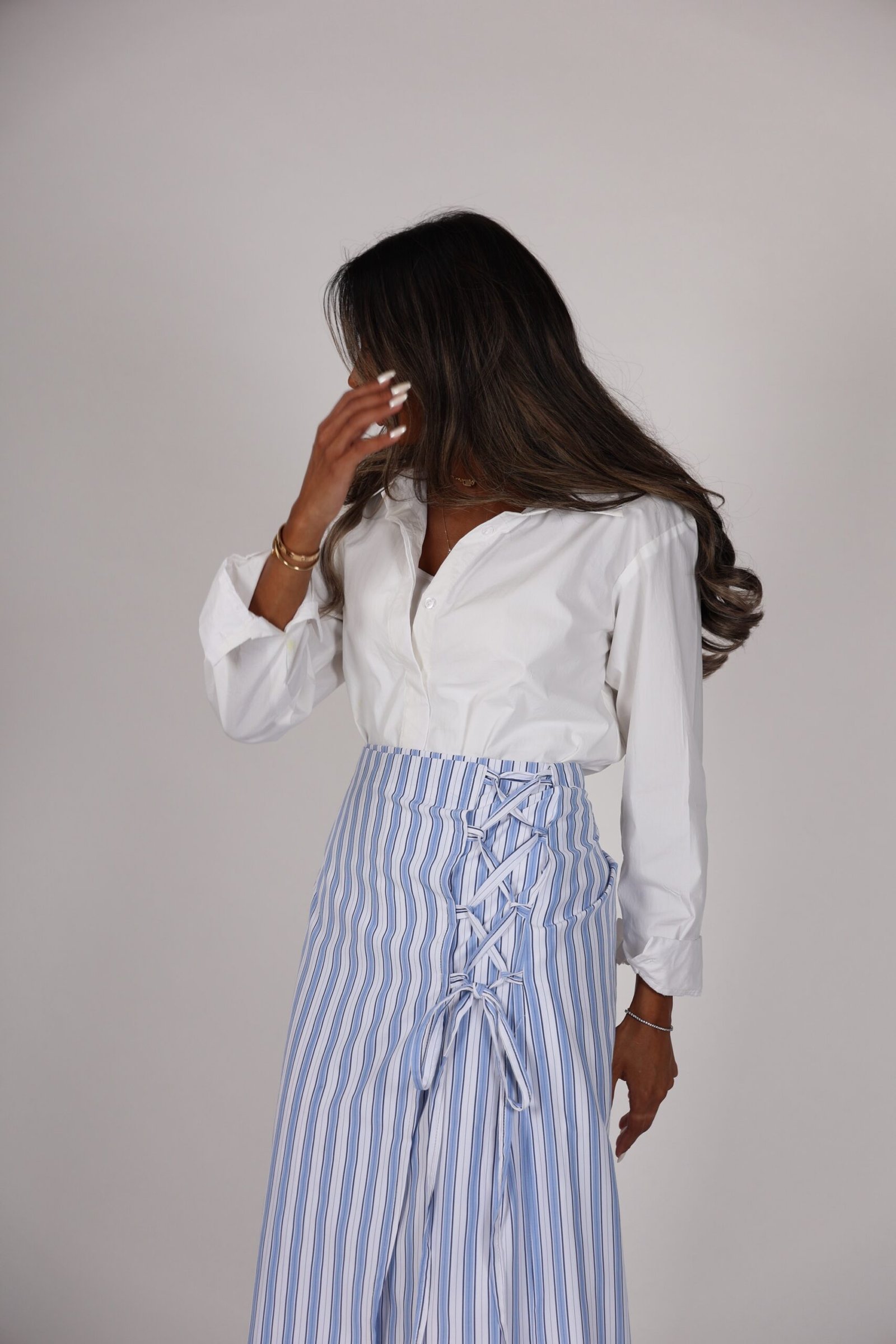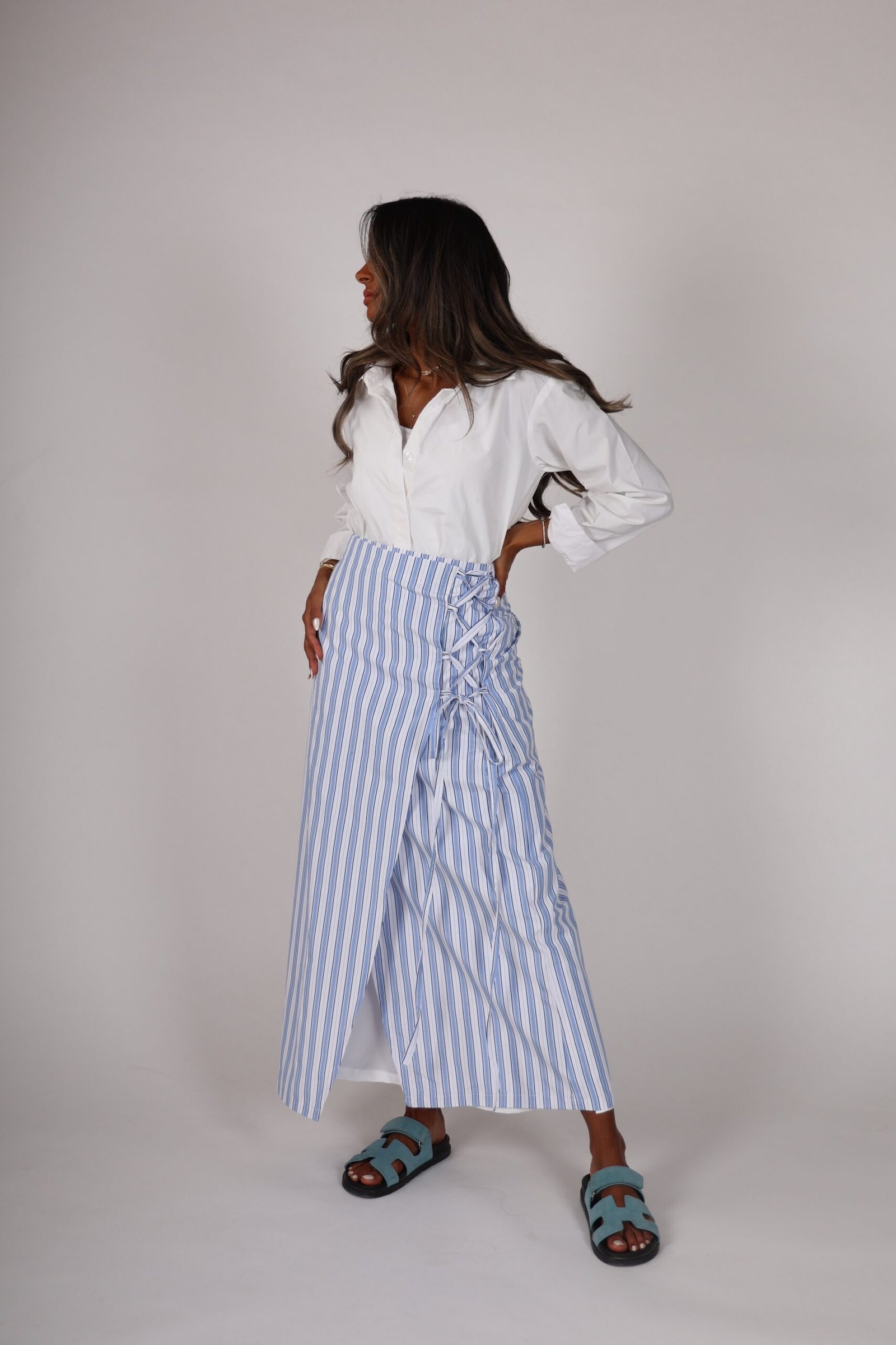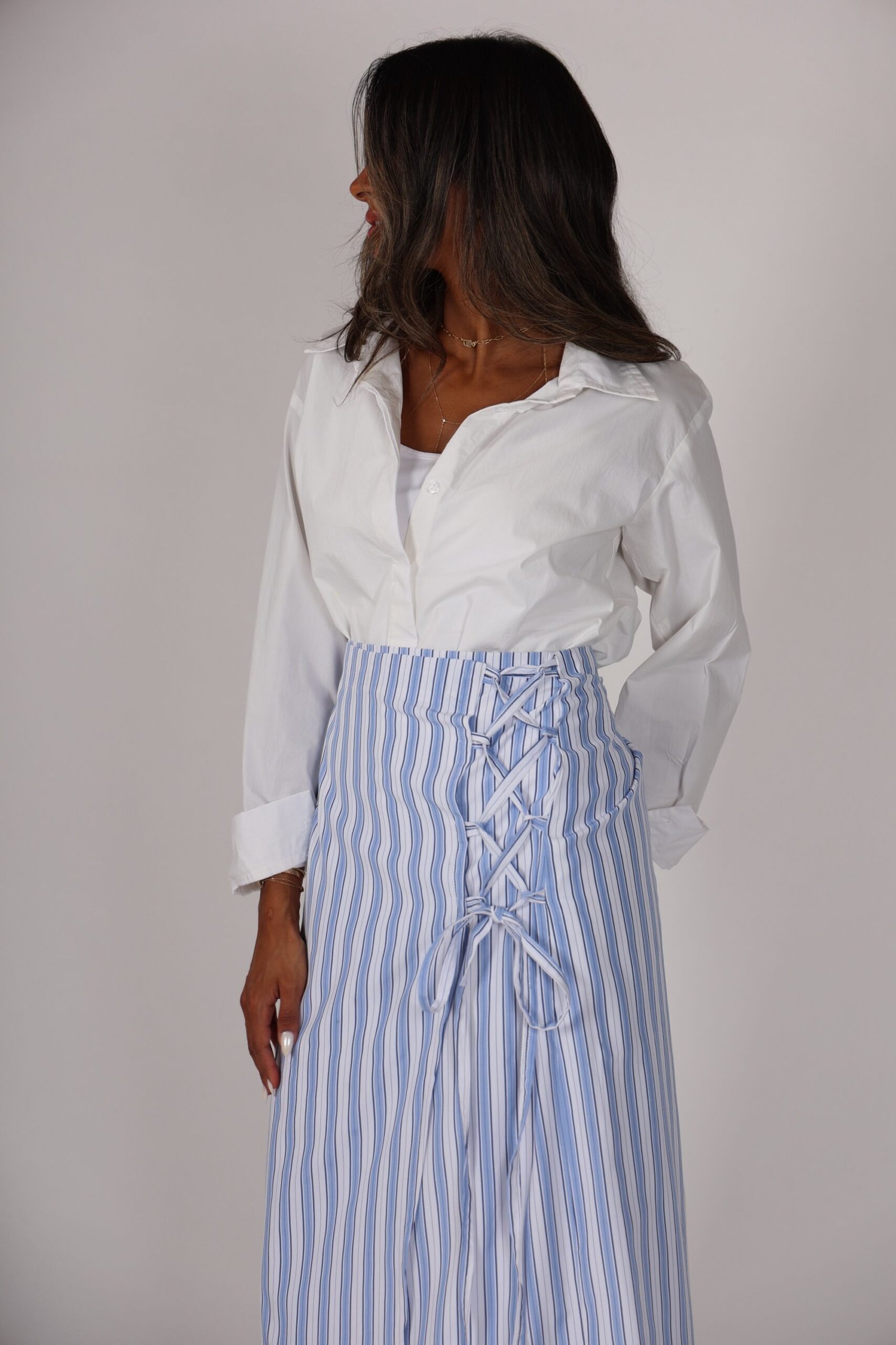 White shirt +wrapped skirt